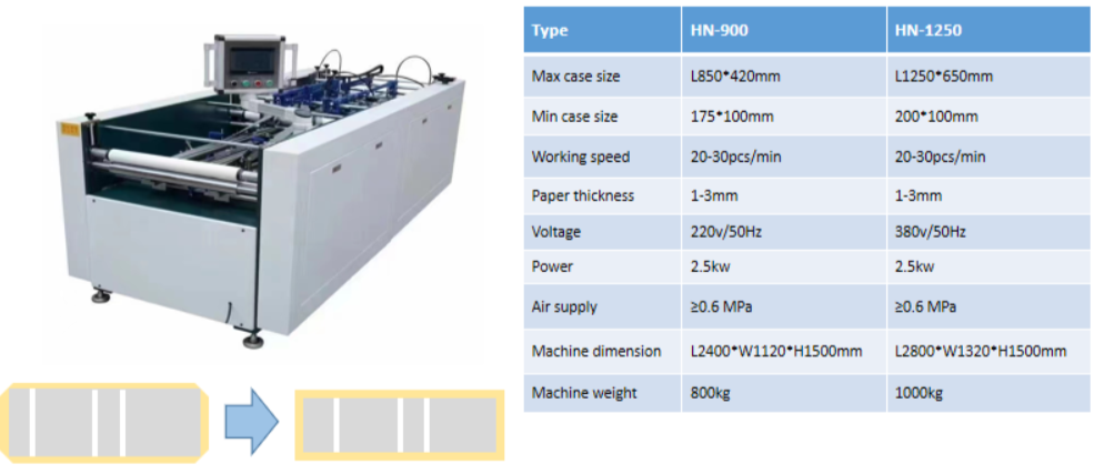 This machine is used for case and hardcover wrapping of book cases, wine boxes, tea boxes, moon cake boxes, notebook cases, calendars, file folders, and other similar products.